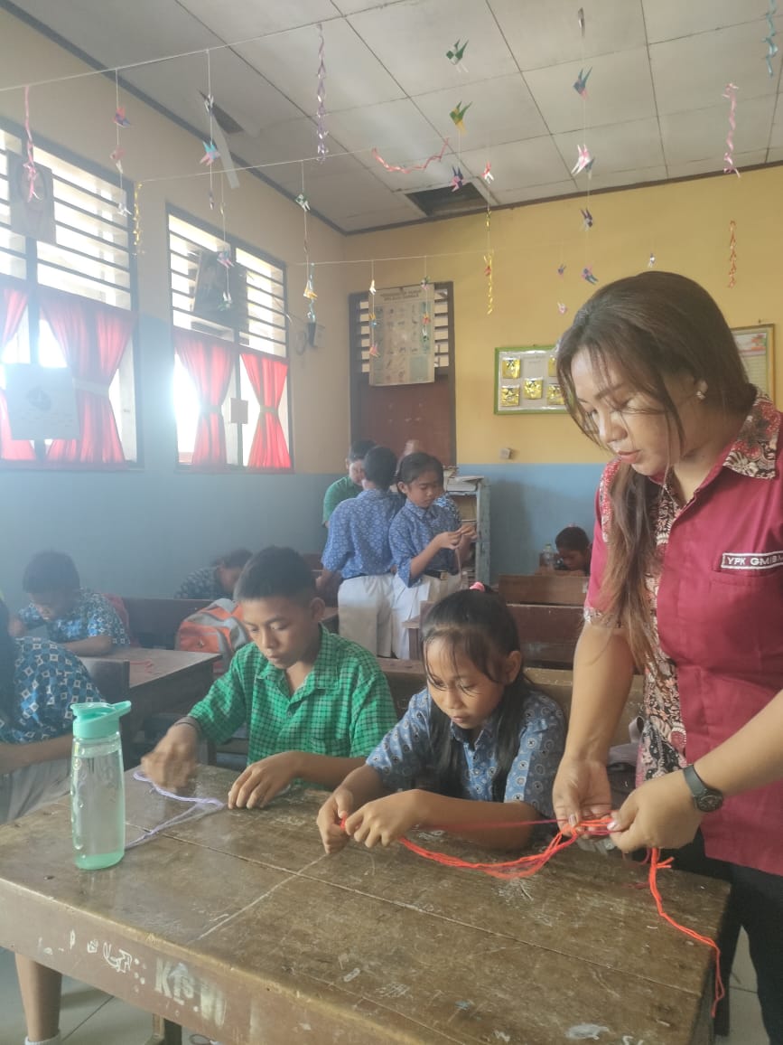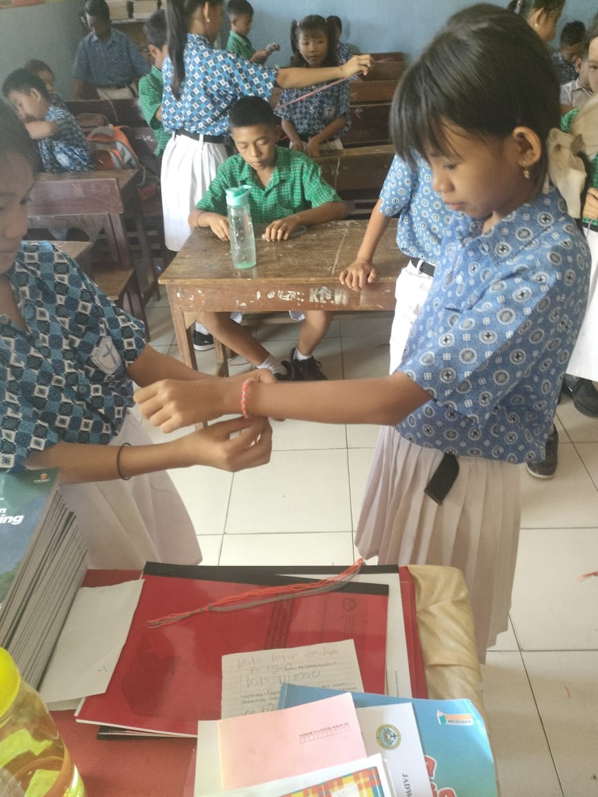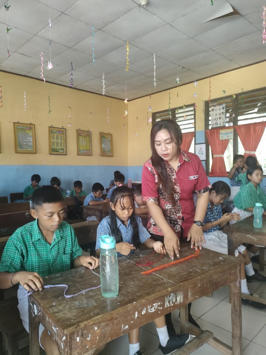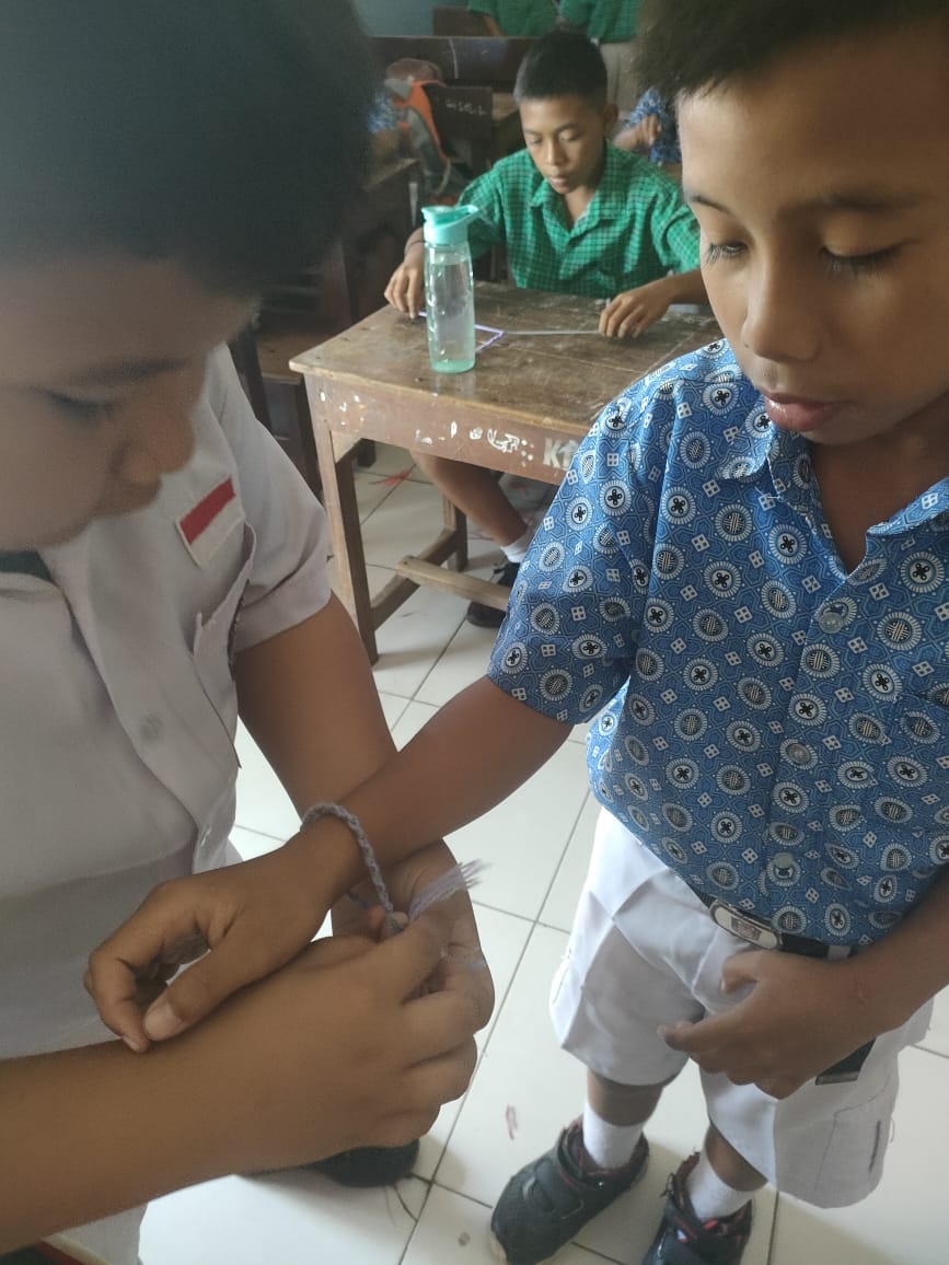Pembuatan simpul yang dibuat peserta didik kelas V, dengan didampingi oleh wali kelas V, Ibu Christi N. Munandar, S.Pd menghasilkan hasil karya berupa gelang warna-warni yang unik dan menarik.
